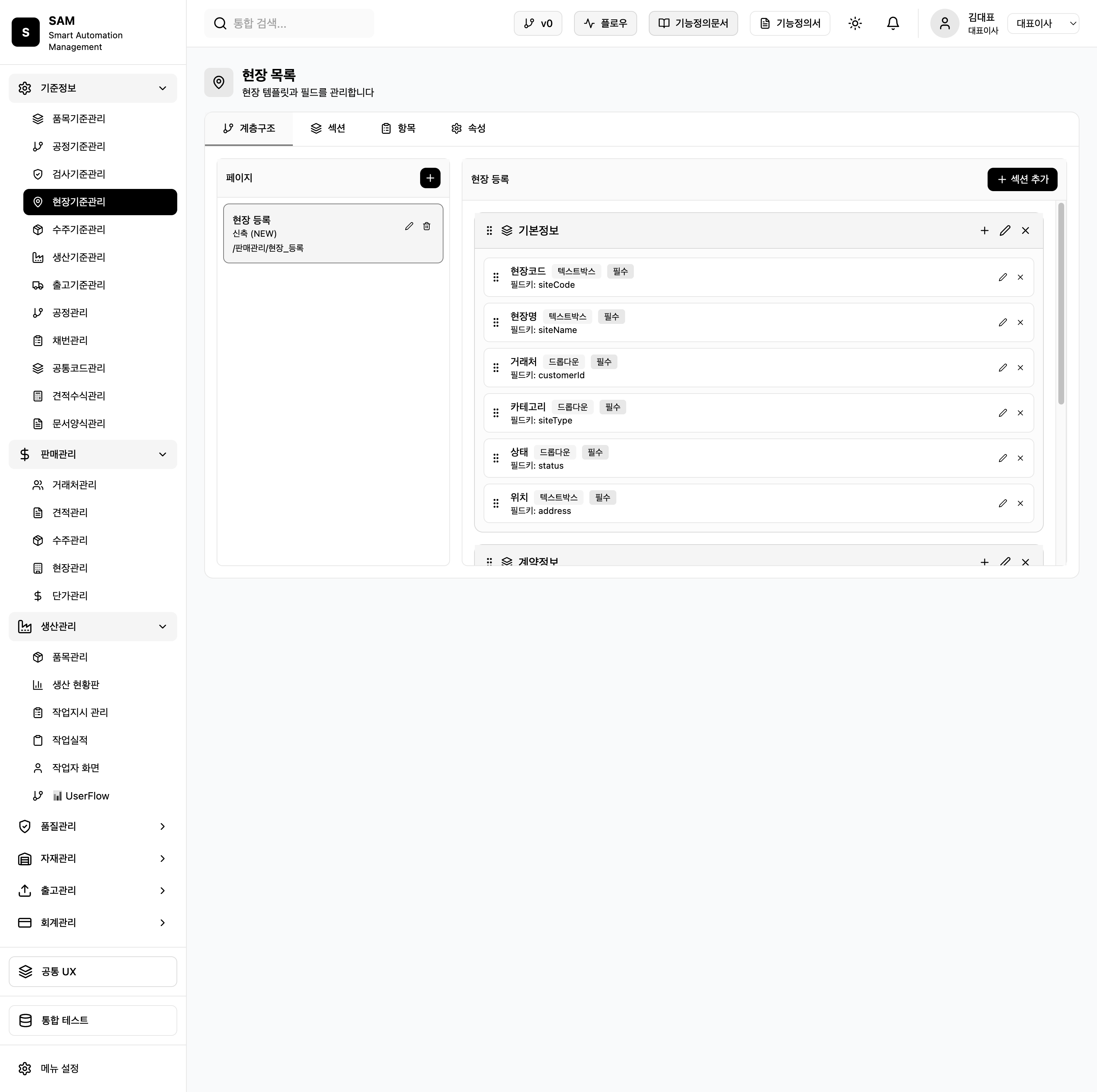 - 12개 하위 메뉴 분석 및 스크린샷 캡처 - EAV 메타관리: 품목/공정/검사/현장/수주 기준관리 - 마스터 데이터: 생산/출고 기준관리, 공정관리, 채번관리, 공통코드, 문서양식 - 수식 엔진: 견적수식관리 (44개 수식, 13개 카테고리) - API 스펙 및 데이터 스키마 정의 - 구현 우선순위 정리